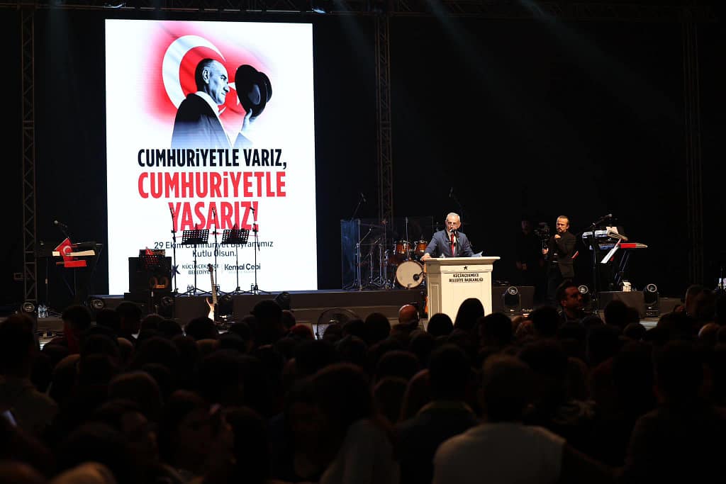 Konser alanında sona eren yürüyüşün ardından vatandaşlara seslenen Küçükçekmece Belediye Başkanı Kemal Çebi de Cumhuriyet Bayramı mesajında, “Ne mutlu ki bize bugün cumhuriyetimizin 101. yıl dönümünü büyük bir gurur ve coşkuyla kutluyoruz. Bugün, sadece bir yönetim biçimini değil, aynı zamanda halkımızın iradesini, eşitliğimizi, özgürlüğümüzü ve haklarımızı kutluyoruz. Cumhuriyet bize fırsat eşitliği tanıyor. Örneğin bana müthiş bir fırsat eşitliği tanıdı. Ben Cumhuriyet ile gözlerimi açtım. Ondan sonra bana devlet okullarında okuma fırsatını verdi. Daha sonra yaşadığım kentin bir milyona yaklaşmış olan nüfusu ile belediye başkanı seçilme fırsatını bana cumhuriyet verdi. Bu sebeple cumhuriyete borçlu hissediyorum. Bizler, zorlu zamanlardan geçtiğimiz bu günlerde birlik ve beraberliğimize daha sıkı sarılarak, cumhuriyetimizin temel ilkelerine ve Atatürk’ün çizdiği yola sadık kalarak, demokrasimizi güçlendirmeye devam edeceğiz” ifadelerine yer verdi.