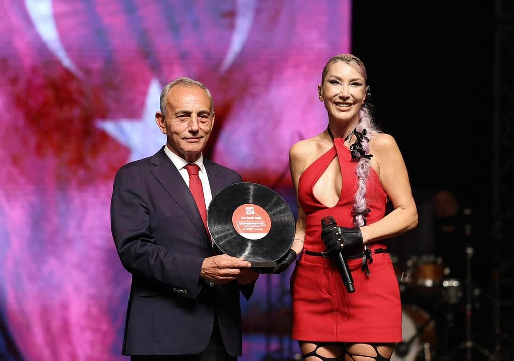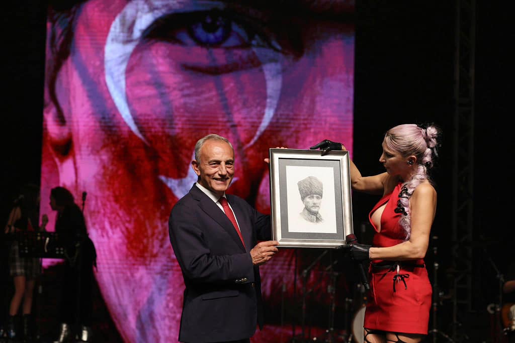 Konser sonunda Başkan Çebi, ünlü sanatçı Hande Yener’e teşekkür ederek, günün anısına plak ve Atatürk portresinden oluşan bir karakalem tablo çalışması takdim etti.
